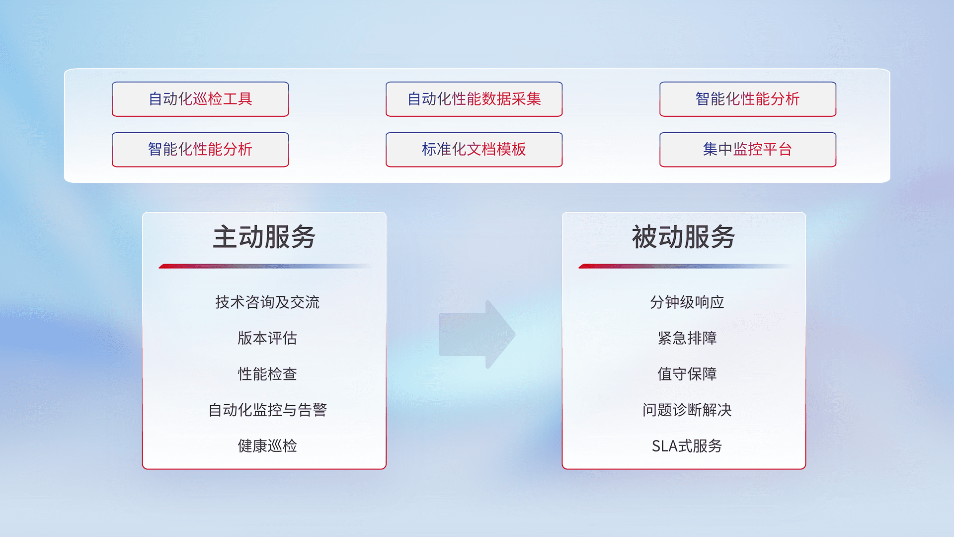 智能化工具和标准化文档,,保障服务质量,,,提供主动服务(包含技术咨询、、、版本评估、、性能检查、、自动化监控与告警、、、健康巡检)和被动服务包含(分钟级响应、、、紧急排障、、、、值守保障、、、、问题诊断解决、、SLA服务)。。
