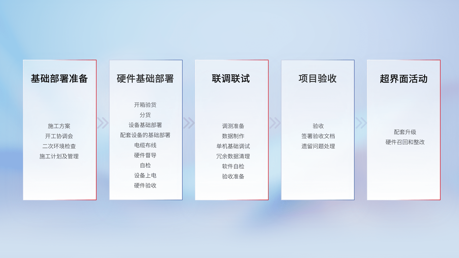 从基础部署准备、、硬件基础部署、、、、联调联试、、、、项目验收、、、、越界面活动的全过程可追溯,,保证施工质量和进度。。。